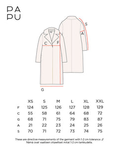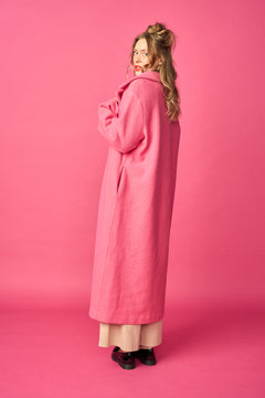 Women’s long pink wool coat featuring large lapels and hidden side seam pockets. This lightweight wool coat has a straight, relaxed fit. The length is ideal for pairing with trousers, dresses, or skirts. Slightly dropped shoulder line. Front closure with large snap buttons. The coat is unlined. Please refer to the size chart for approximate measurements.